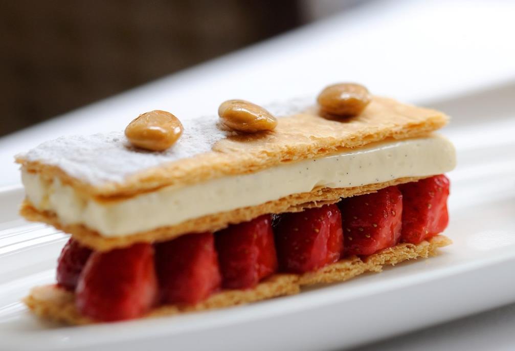 法餐的甜点可以是比较清淡的,比如草莓慕斯、蛋糕、糕点,甚至可以是一些简单的水果。