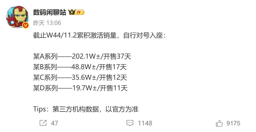 作为对比我们看下国产旗舰手机的销量,目前除了华为,其他4大国产品牌的旗舰手机都已经发布。同样来自“数码闲聊站”的数据, 同样截止W44,某米17系列总激活量超202万台,某X300系列总激活量超48万台,某Find X9系列总激活量超35万台,某magic8系列接近20万台。