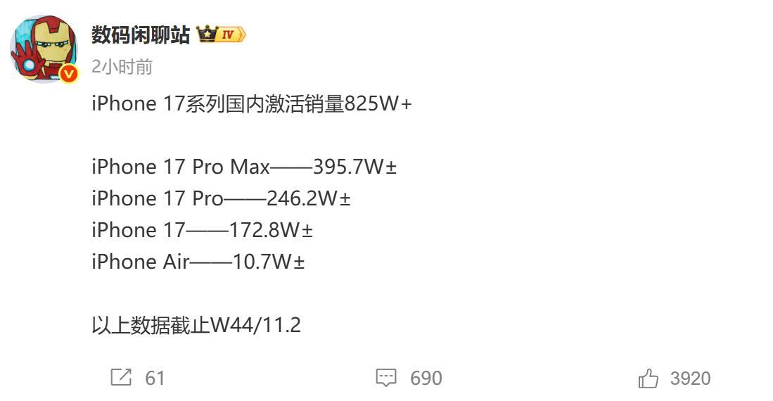 苹果17系列国内买疯了!iPhone17系列作为近几年改动升级最大的一款iPhone,Pro和Pro Max虽然创新有限,但凭借外观方面的改动,销量实现了较大的增长,标准版由于补齐了屏幕和存储方面的短板,加量不加价,更是实现了销量翻倍,虽然新增机型iPhone17Air国内销量惨淡,但不影响全系销量实现大涨。根据博主“数码闲聊站”提供的数据,苹果17系列上市不到2个月,国内激活量超800万台。